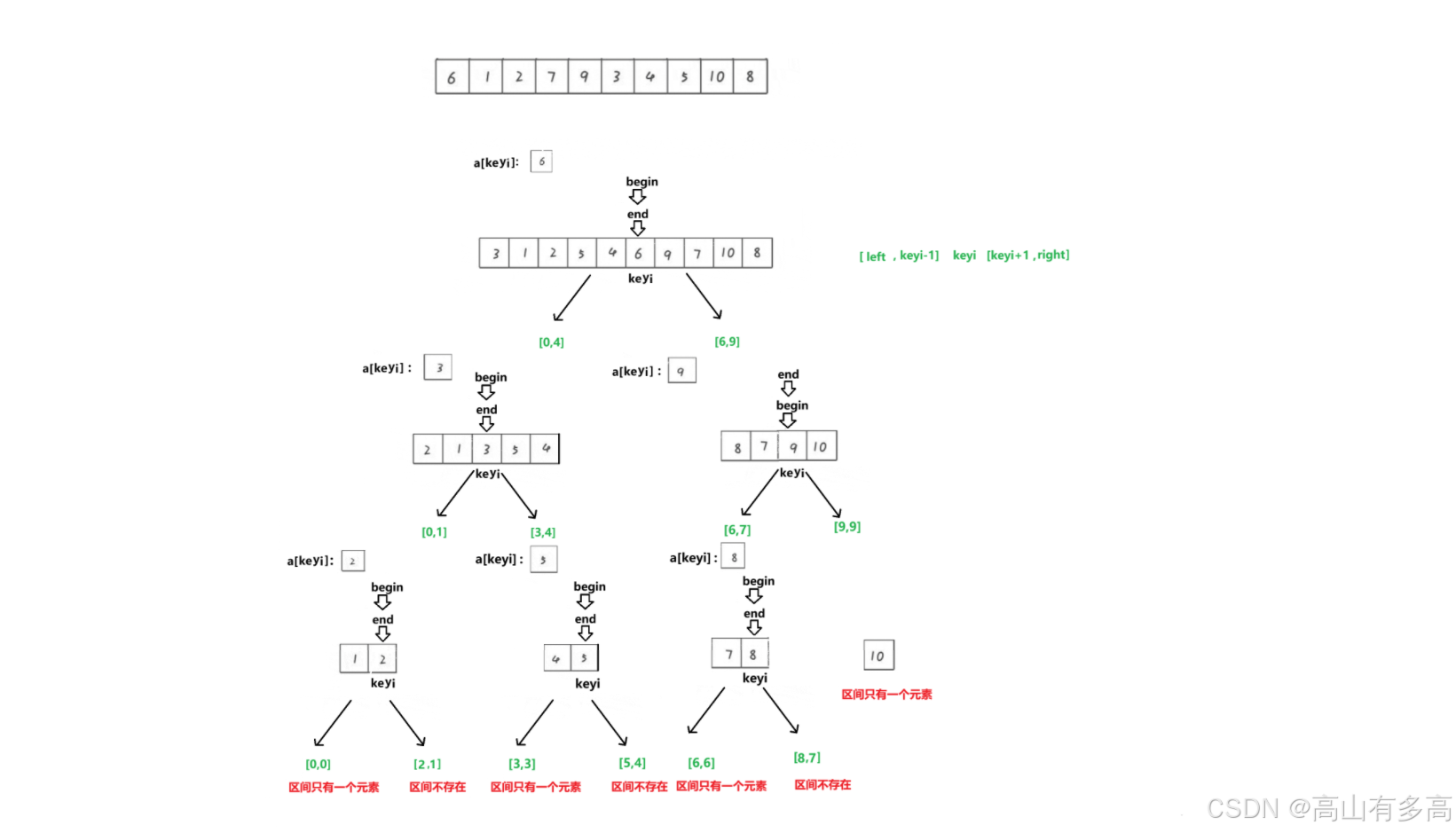 [0, N-1]第二步:循环处理 这是一个while(栈非空)的循环: 1.弹栈(Pop):拿出一个任务(begin,end)。 2.分区(Partition):通过Hoare分区法进行分割当前处理任务,keyi = PartitionSlowFast(a, begin, end); 将其分为 [begin , keyi - 1] keyi [keyi+1 , end] 3.记录左右区间:记录左区间 left1 = begin right1=keyi-1 即 : [left1 , right1] 记录右区间 left2 = keyi+1 right2=end 即:[left2, right2] 4.入栈左右区间: 优先压入右区间,再压入左区间,因为栈是“后进先出”,这样下一轮循环就会先处理左边,模拟递归的顺序。 压入右区间:push (right2) -> push(left2) 压入左区间: push (right1) -> push(right2) (💡 小贴士 : 区间只有一个元素不入栈,区间不存在也不入栈 ) 第三步:栈为空 当栈变空时,说明所有的大区间都被切成了小区间,小区间都被切没了(排序完成),数组就有序了!🎉