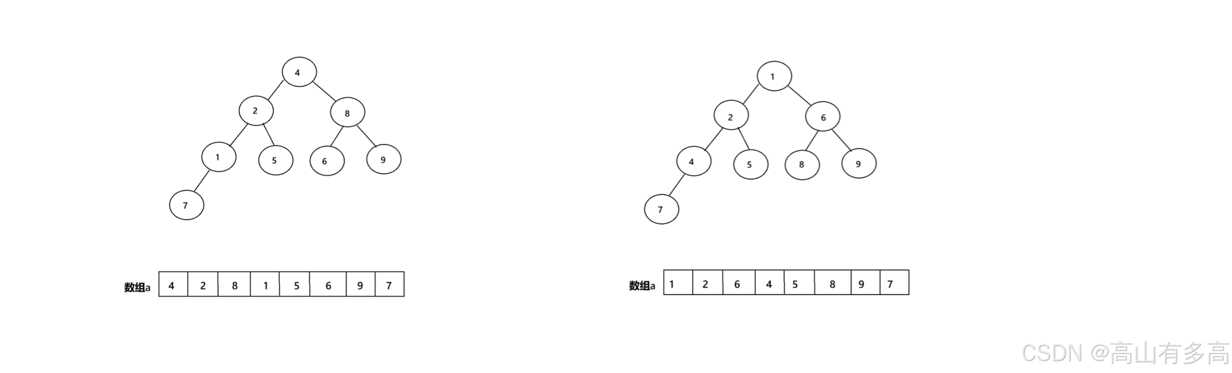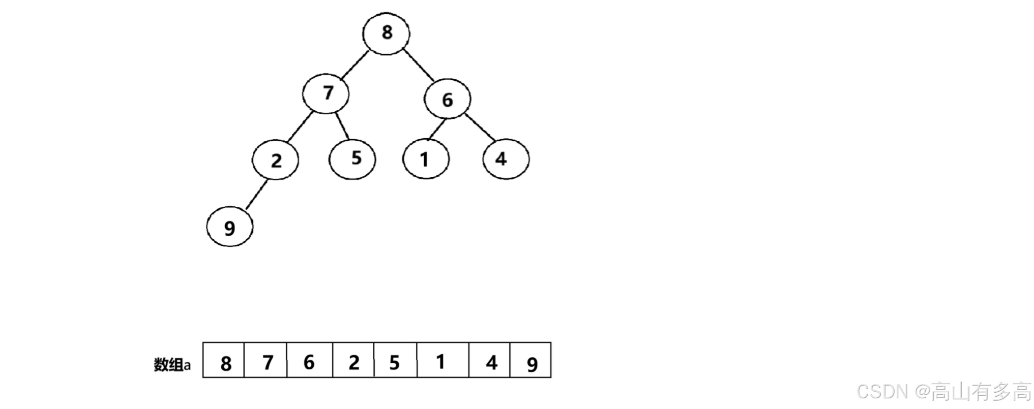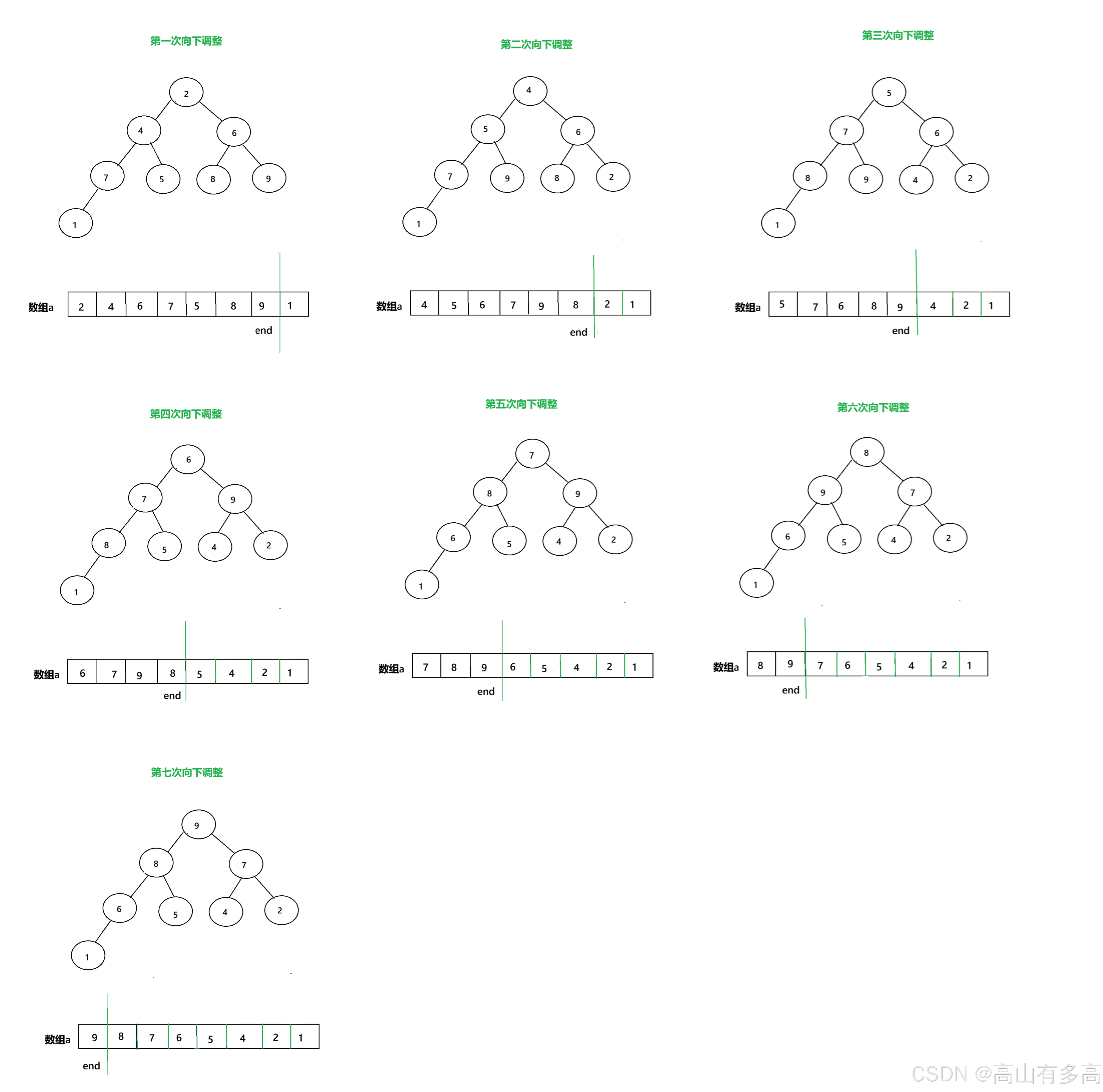 1.建堆:排序前的数组是完全无序的(比如: [4,6,8,5,9,1,3,2,7]),此时无法直接快速找到最大值 或 最小值。