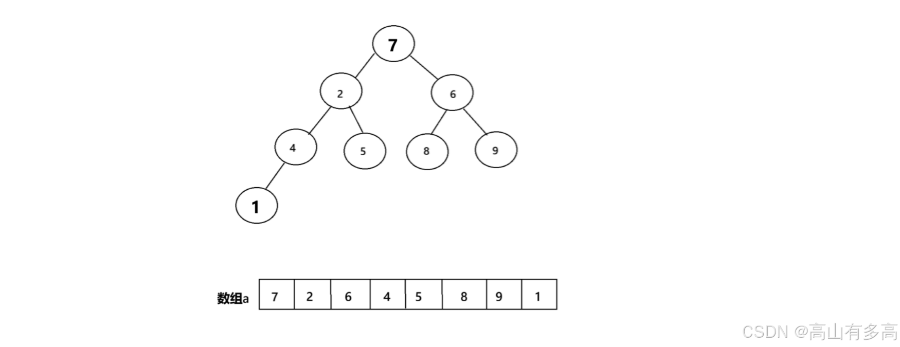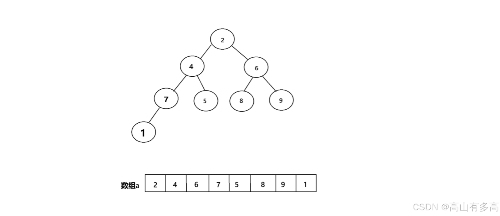 步骤二:将堆顶元素与最末尾元素进行互换,如图所示,将堆中最小的元素1与堆尾元素7进行互换,则最小元素放在了堆尾,最小值1被固定到数组末尾(最终位置),后续不再处理,未排序区域缩小为[7,2,6,4,5,8,9]。