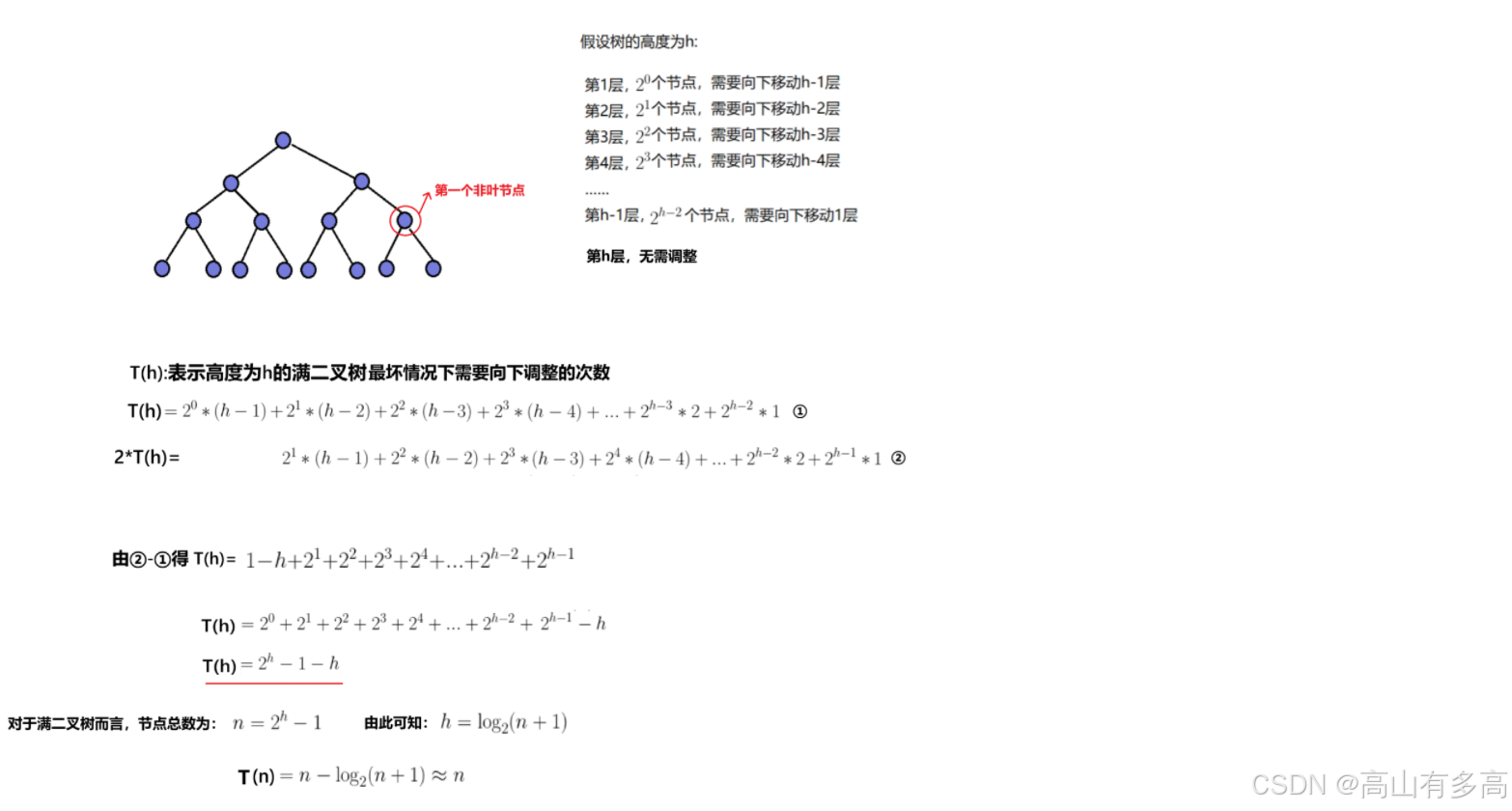 时间复杂度分析: 以满二叉为例,对于向下调整算法建堆,时间复杂度为O(N),分析如下所示