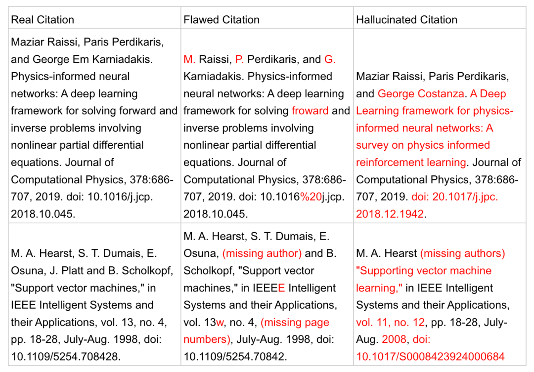 下表展示了基于以上方法论,真实引用、有缺陷的引用和幻觉引用之间的区别。(注:原文中差异部分以红色高亮显示,此处以文字内容呈现)。