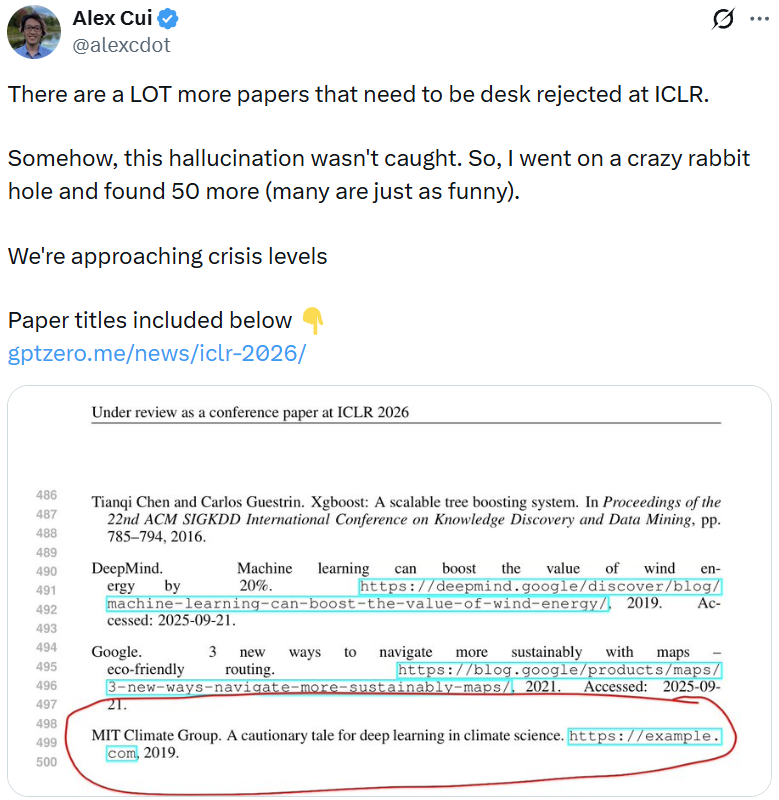 甚至有些幻觉引用还非常离谱,达到了匪夷所思的程度,就好像投稿者完全不检查一样。比如下面 GPTZero CTO 和联创 Alex Cui 在 X 分享的这个例子,投稿者给出的引用链接竟然是默认示例链接 example.com !