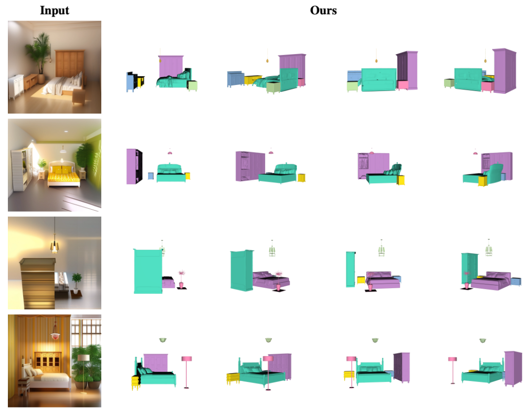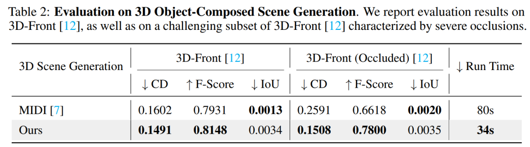 在场景级的物体组合生成任务上,研究团队将 PartCrafter 与 MIDI 模型进行了比较。实验设置在一个从 3D-Front 数据集中挑选的、包含大量严重遮挡场景的子集上。