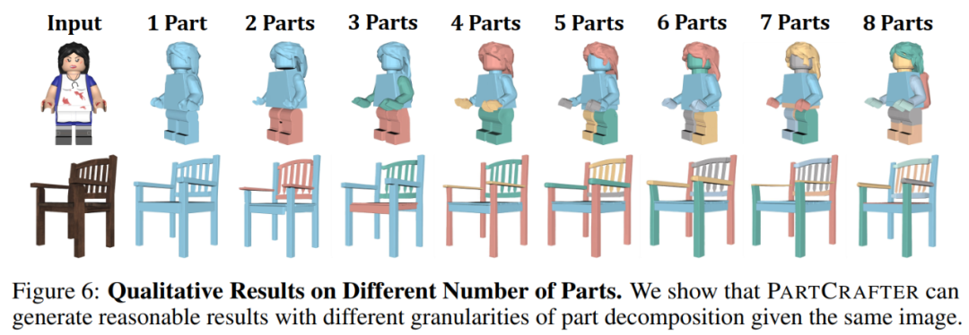 例如,对于同一个物体,用户可以选择将其生成为由 3 个部件组成的粗粒度模型,也可以选择生成为由 8 个部件组成的细粒度模型,这种控制能力在个性化内容创作中具有巨大的应用潜力。