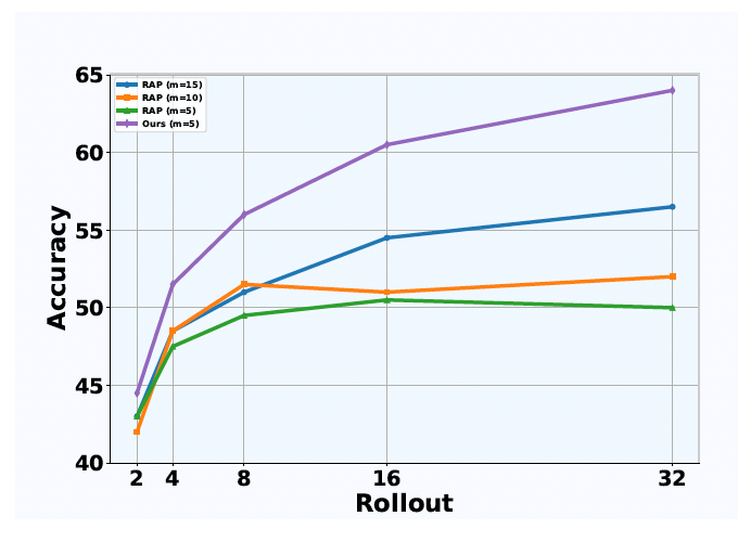 进一步分析显示,随着 MCTS Rollout 次数增加,DynaAct 呈现出稳定的 test-time scaling 趋势:
