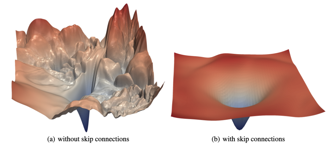 另一个更直观的数学视角,来自于 Tom Goldstein 团队对 Loss Landscape 的可视化研究。