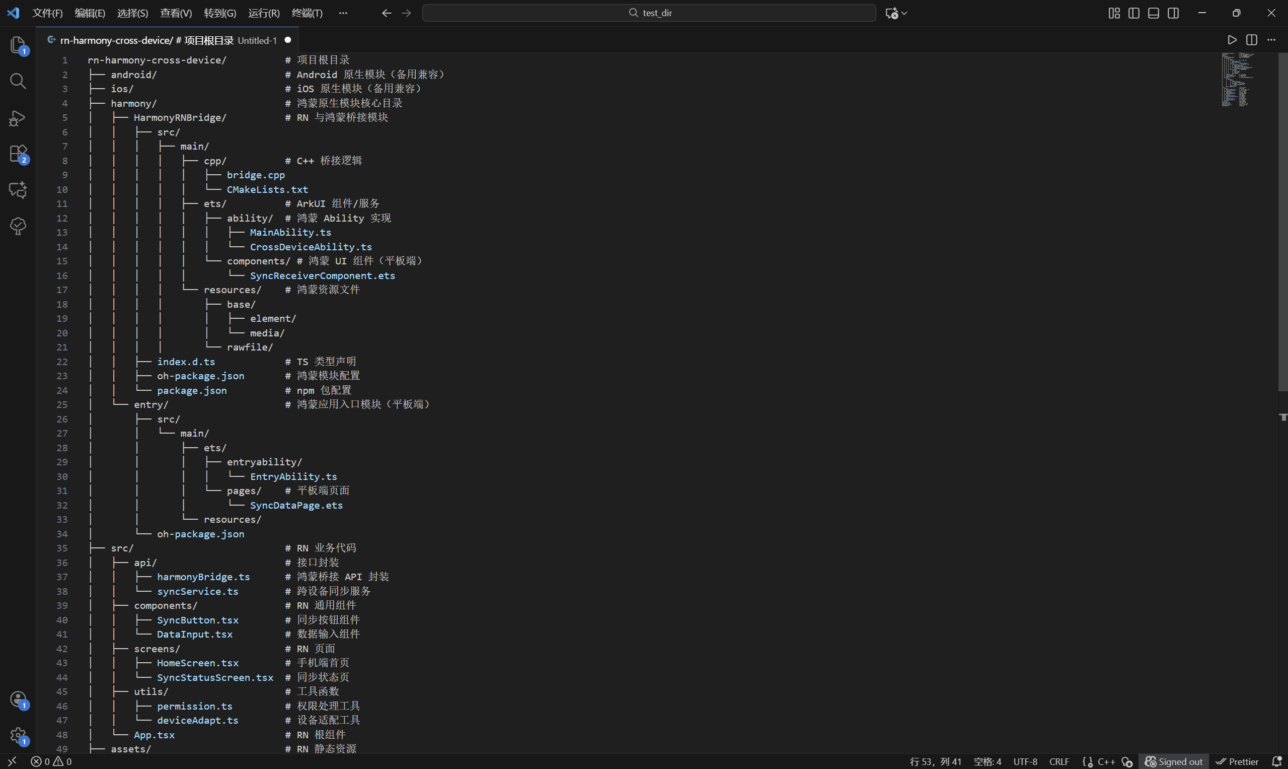 在 DevEco Studio 中新建 HarmonyRNBridge 模块,编写 bridge.cpp: