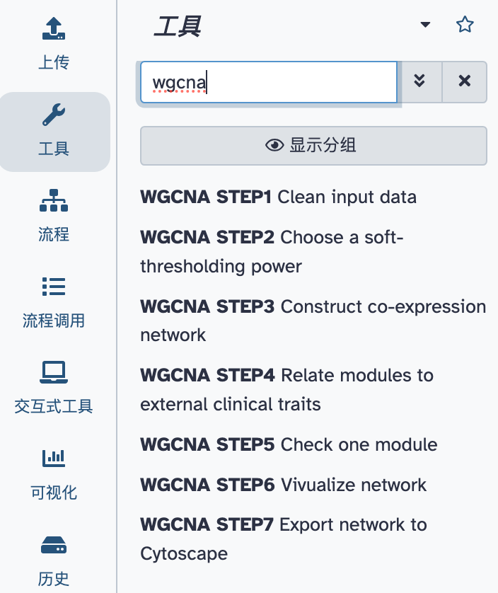 在平台“工具”的搜索框中,我们键入:wgcna,下方即会出现 WGCNA STEP 开头的 7 个工具。我们现在来分别执行这几个工具,从而帮助大家理解 WGCNA 的分析过程。