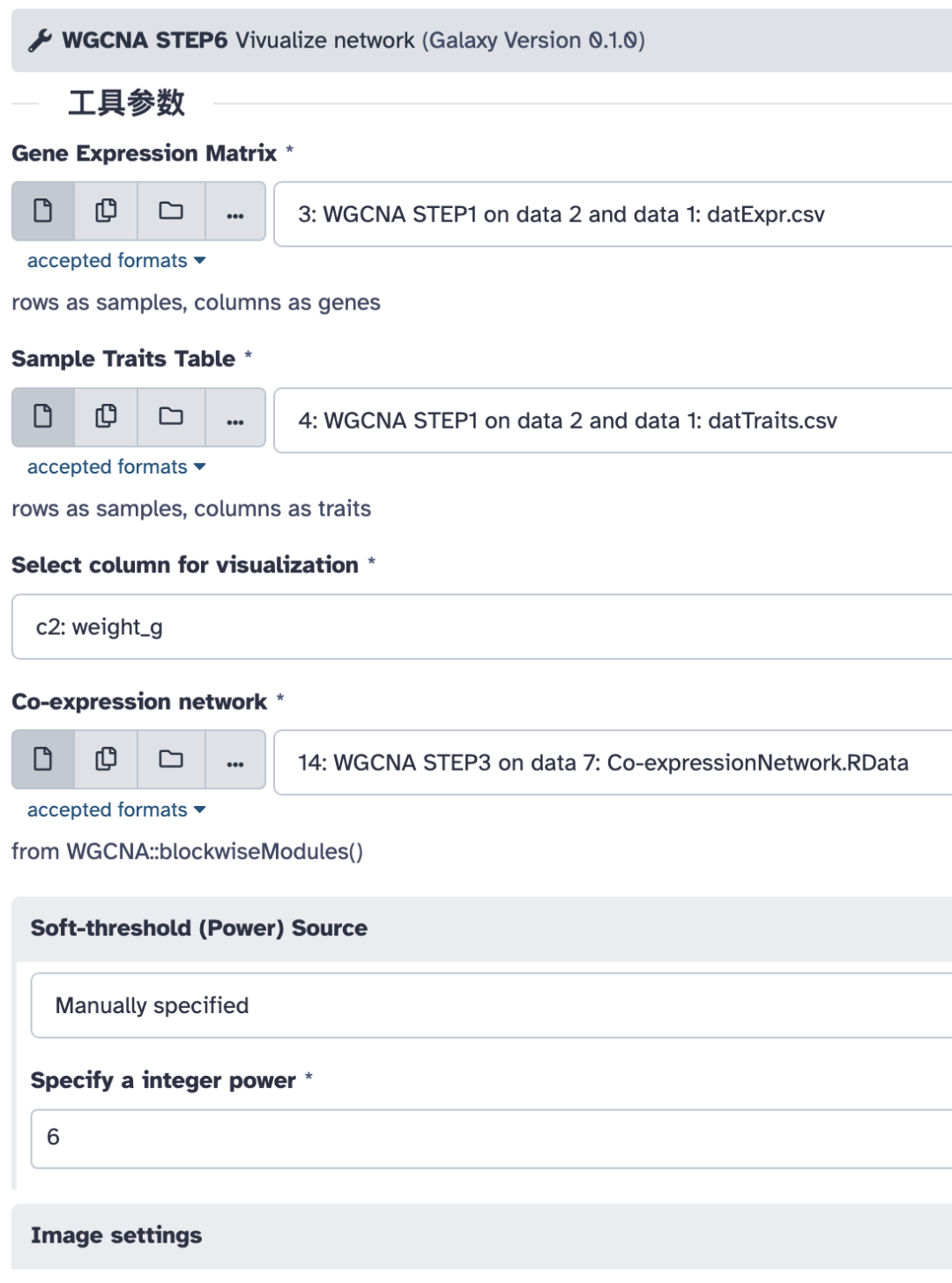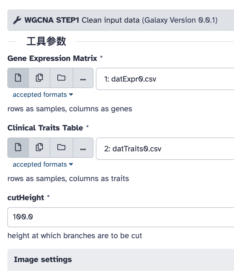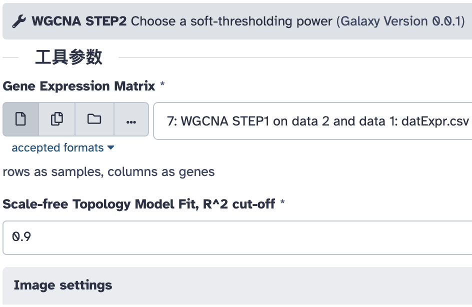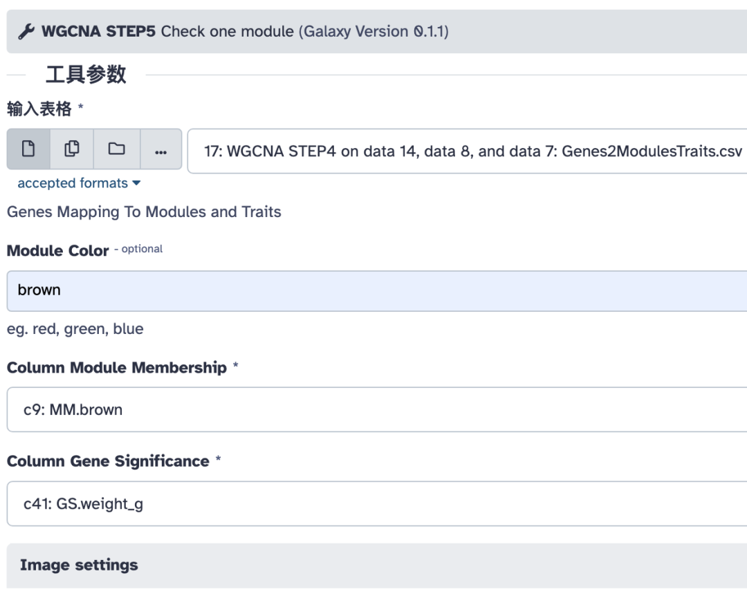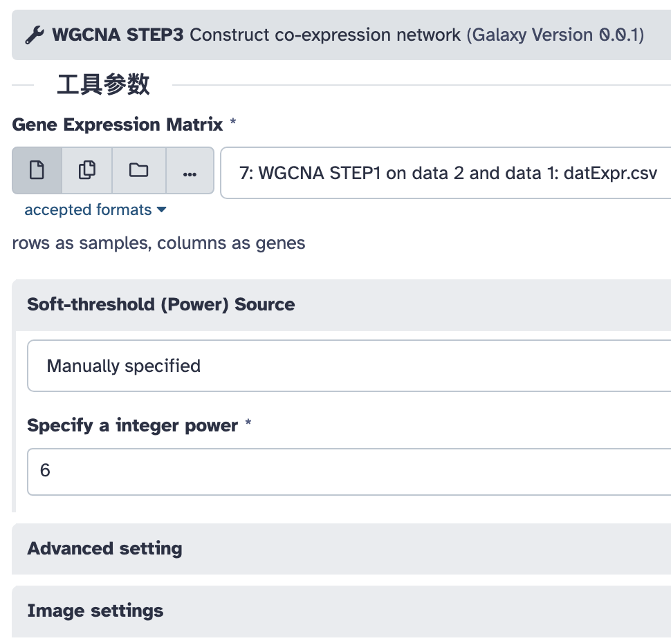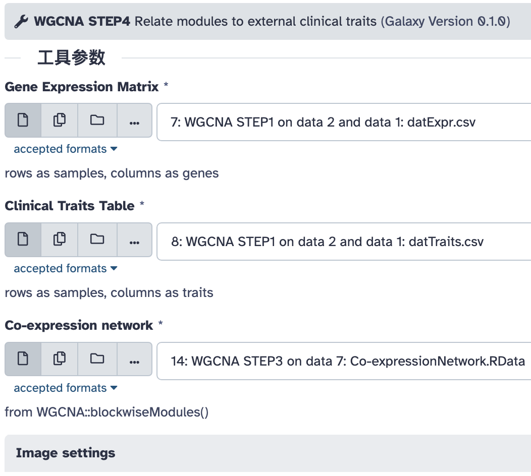 这一步是将基因模块关联到样本的特征。注意这里的基因表达矩阵和样本特征表要选择前面第一步过滤好的,本教程中是历史中的第 7 号、8 号两个文件。另外还要输入上一步构建好的共表达网络。