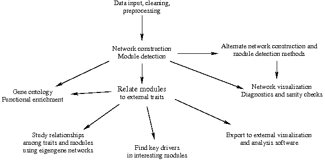 WGCNA 数据分析大致遵循下图所示的步骤,本文会涉及此图的大部分内容。我们先从一键完成开始,然后再介绍分步骤进行 WGCNA 分析的方法。