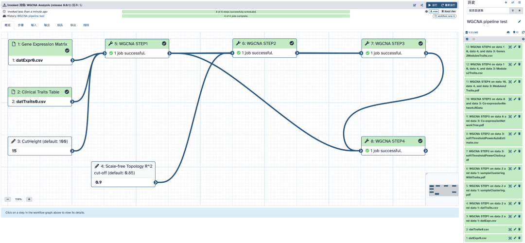 流程运行完毕,所有结果文件都在右侧的历史中,具体的文件内容我们在这里不展开讨论,后面分步执行 WGCNA 的时候再细说。