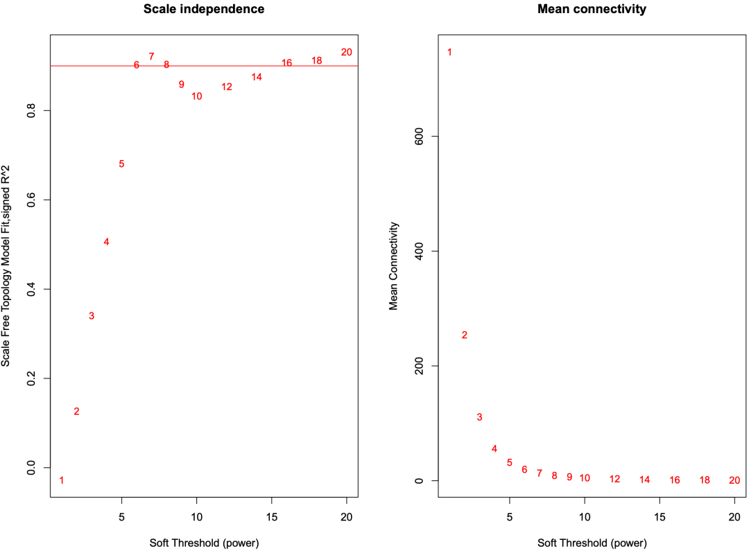 结合左右图,我们可以认为软阈值为 6 是比较合适的,这跟 WGCNA 自动判断得到的值一样。