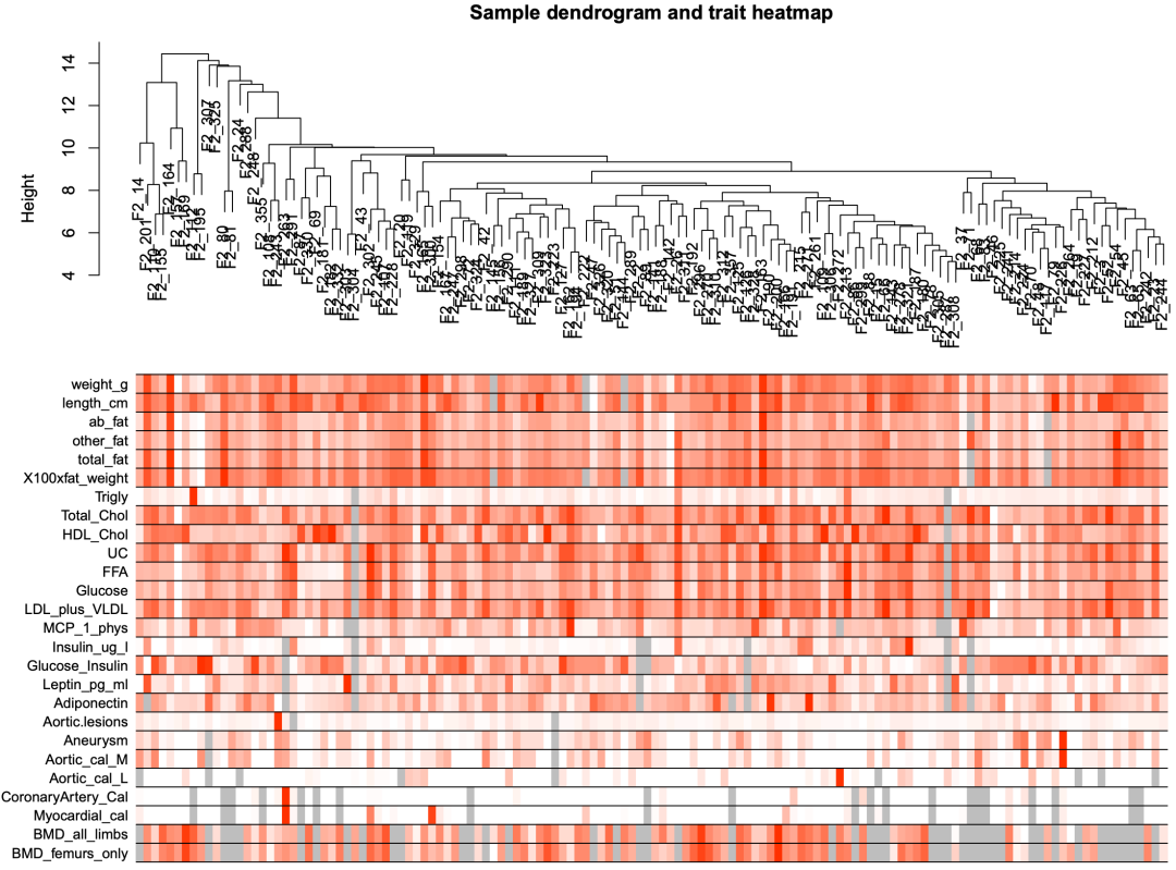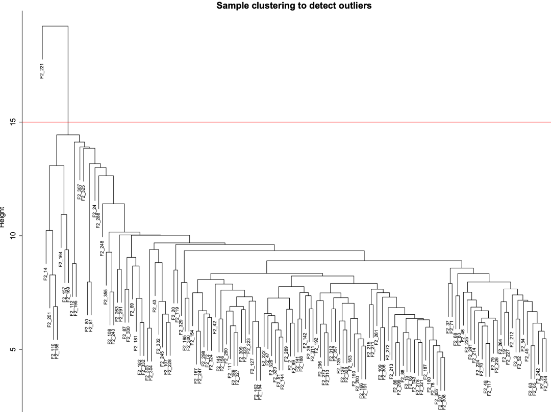 通过 sampleClustering.pdf 图片可以看到,有一个离群样本:F2_221,它在纵坐标 15 的上方,我们可以将 cutHeight 值设为 15,过滤掉该样本。