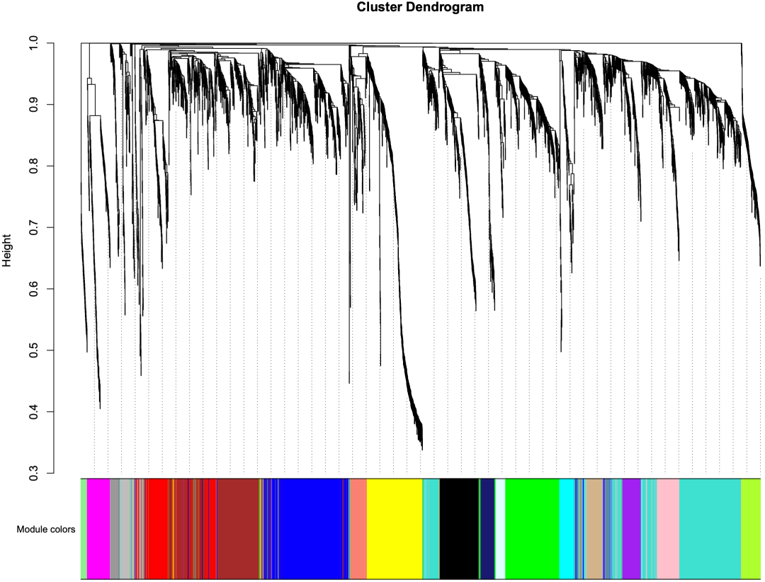 运行完成后,激动人心的时刻到了。我们得到了基因模块的层次聚类图:Co-expressionNetworkTree.pdf,这是可以放到文章当中的: