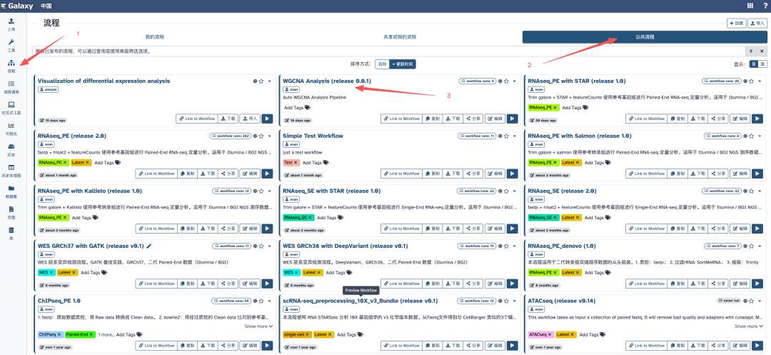 我们首先进入网站:https://usegalaxy.cn,依次点击:流程 > 公共流程 > WGCNA Analysis (release 0.0.1),如图: