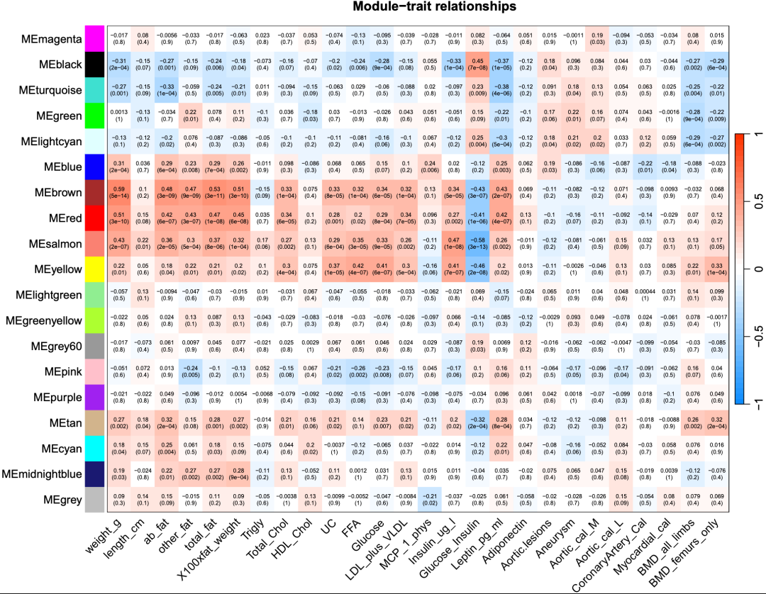 这个图展示了基因模块与临床特征的关联: