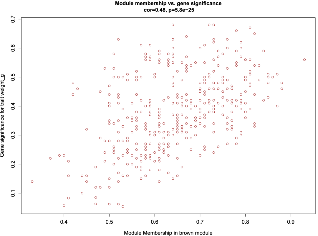这一步是选择具体某一个模块。比如我们通过模块与特征的热图可以看出:brown 模块与 weight_g 相关性达到了 0.59,我们如果对这一个模块感兴趣,可以单独查看该模块的情况。