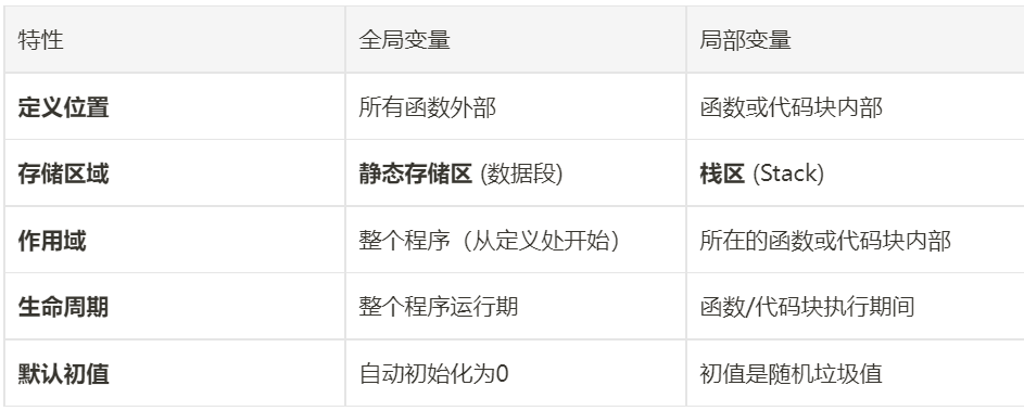 全局变量与局部变量的区别,表面上是声明/定义的位置不同(函数内/外),但其本质是存储位置的不同,这直接导致了它们作用域和生命周期的天差地别。