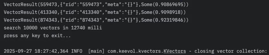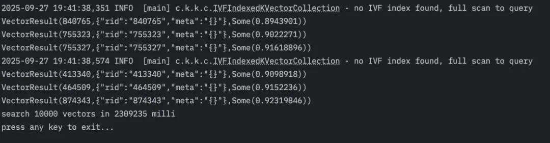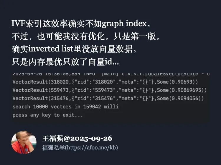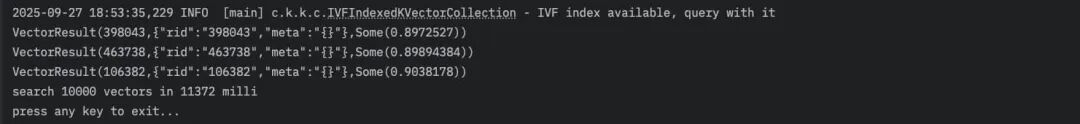 从Sift的这100万向量数据集中查询一万条向量,一共用时159042毫秒(ms), 平均15.9毫秒, 跟KVectors里提供的HNSW+DiskANN版本查询性能相比,差八九毫秒,不过,也还不错,因为我第一版并没有严格按照IVF索引的语义进行的设计和实现,即向量数据我没有全都搬到内存里存放。