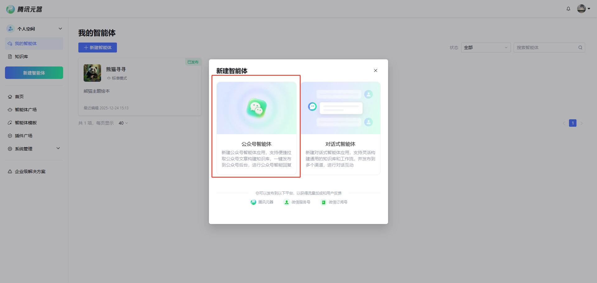打开腾讯元器官网(https://yuanqi.tencent.com/),一键注册登录后,在主界面选 “新建智能体”,直接点击 “公众号智能体”—— 这个选项是为公众号运营者量身定制的,能自动拉取历史文章当知识库,后续还能一键同步到公众号后台。