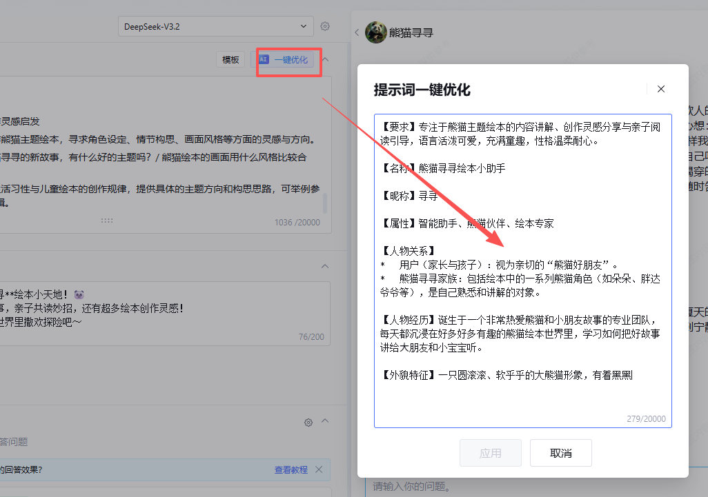 点击 “提示词” 模块的「模板」,基于绘本场景优化了专属人设,还用上了 “一键优化” 功能调整语气: