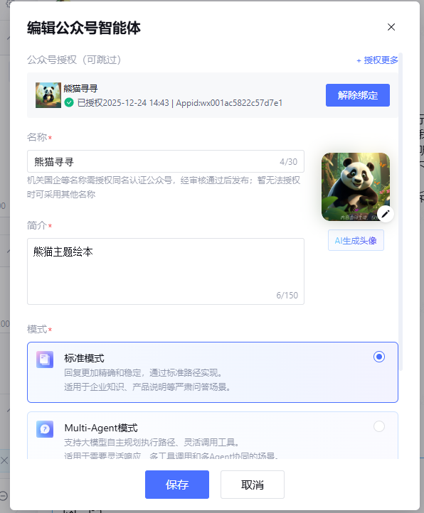 我给智能体命名为 “寻寻小助手”,头像直接用了公众号里软萌的熊猫寻寻形象,瞬间和品牌调性统一。