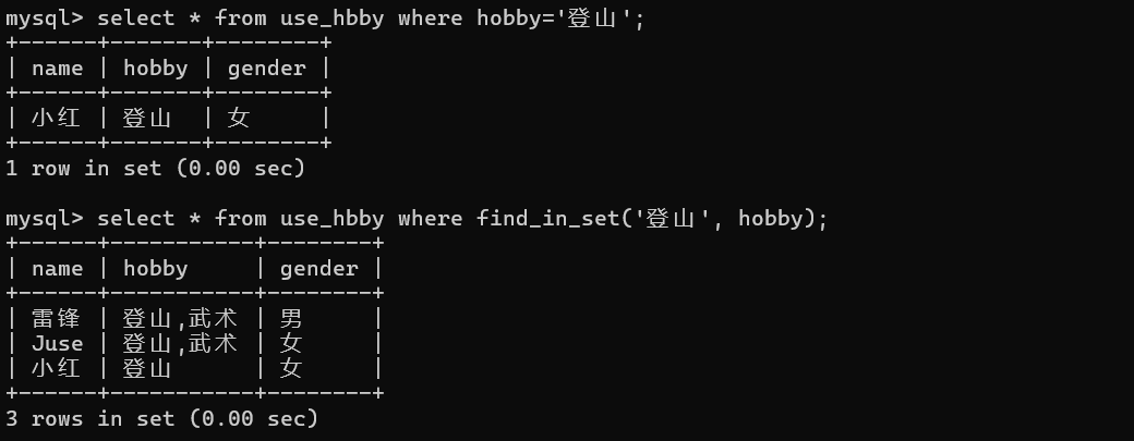 select * from votes where find_in_set( ' 登山 ' , hobby);