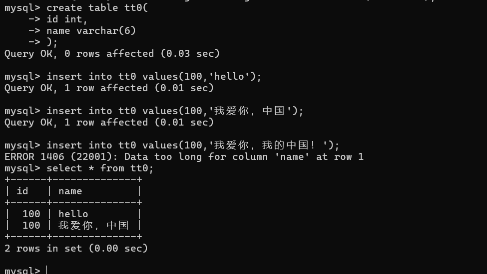 char(L): 固定长度字符串,L是可以存储的长度,单位为字符,最大长度值可以为255mysql> create table tt9(id int, name char(2));