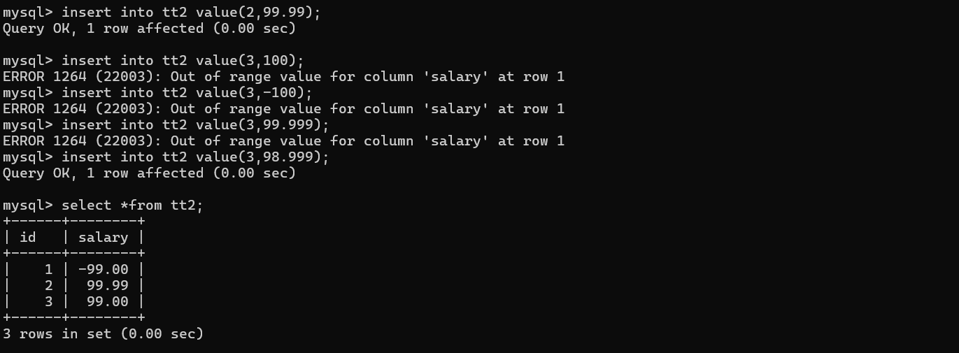 mysql> create table tt7(id int, salary float(4,2) unsigned);