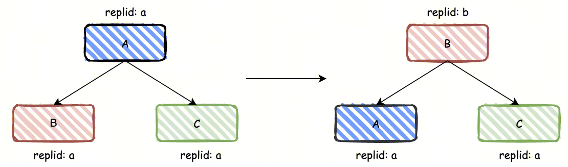 PSYNC2下主从复制 replid的变更流程详见下图。节点B在提主后将A的id记录在replid2中。申请同步时,A、C的replid a与B的replid2 a一致,因此能进行增量同步。同步后A、C的replid变更为新主的b。