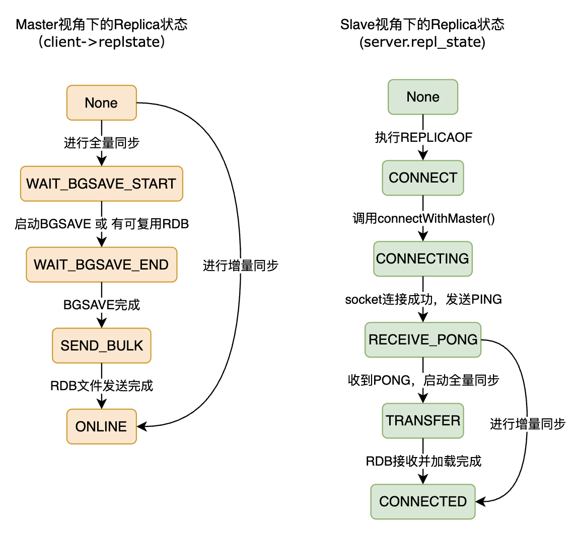 Redis的主从复制实现有一套完善的状态机设计,与本小节相关的是如下4个状态: