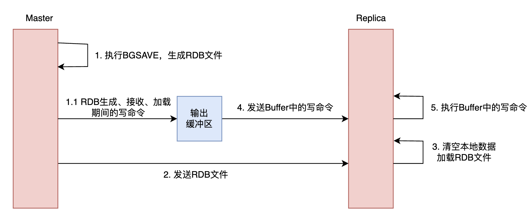 在全量同步过程中,从节点的数据实际上有两个来源:主节点发来的RDB快照以及输出缓冲区中的写命令。Redis需要保证: