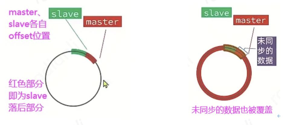 当replica断连一段时间重连后,只需要master向replica发送repl_backlog中落后部分的写命令即可,避免了全量同步的较大开销。例如在图8中,用一个圆圈表示复制积压缓冲区,左边的master只需要将红色部分的字节发送给从节点即可;而右边master的复制积压缓冲区已经写满了一圈并且覆盖到了未同步的数据,因此只能遗憾地进行全量同步。