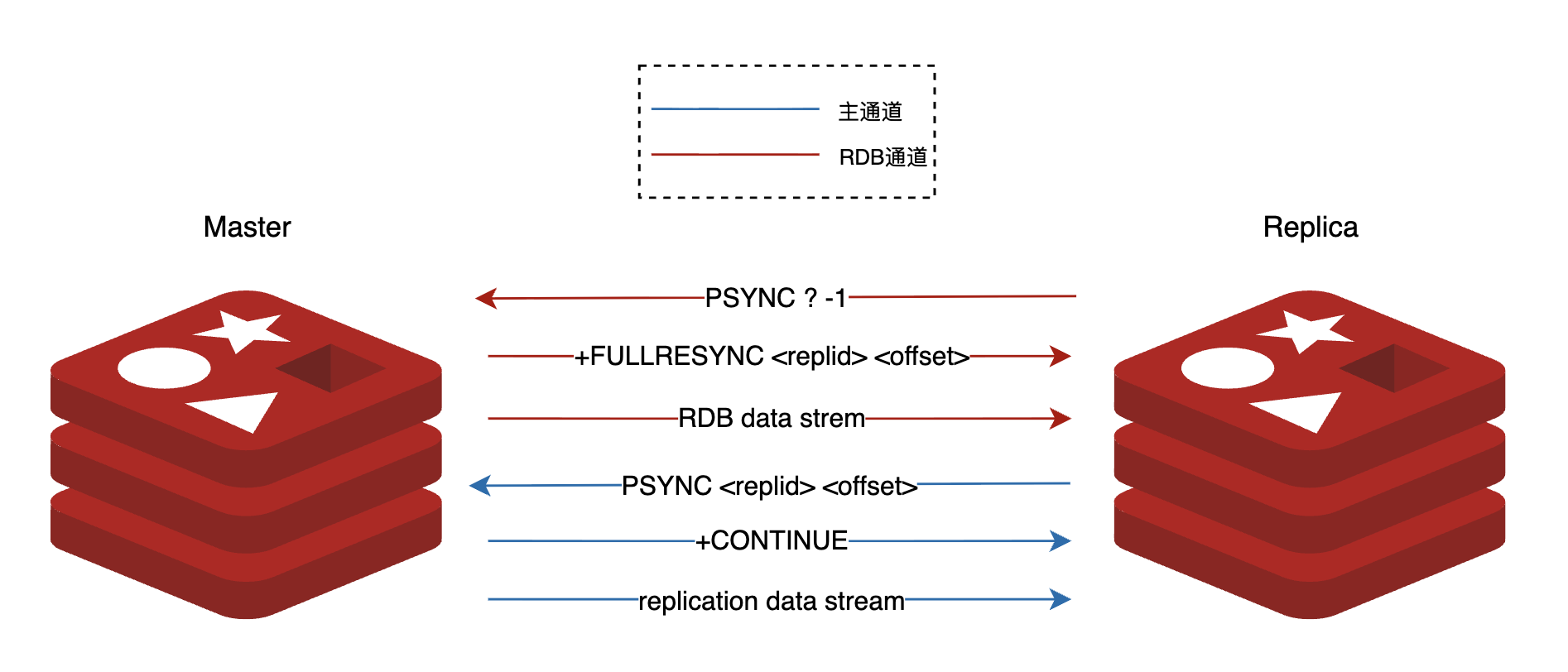 为了将自己当前的数据完整地发给从节点,主节点首先会生成一个 RDB 文件,它是主节点当下的数据快照,存储了主节点在该时刻的所有数据。为了避免 RDB 的生成影响主进程的性能,主节点会执行 BGSAVE,fork 出一个子进程来负责 RDB 快照的生成。待 RDB 快照生成后,主节点将其发送给从节点,从节点接收后清空本地数据并加载 RDB。