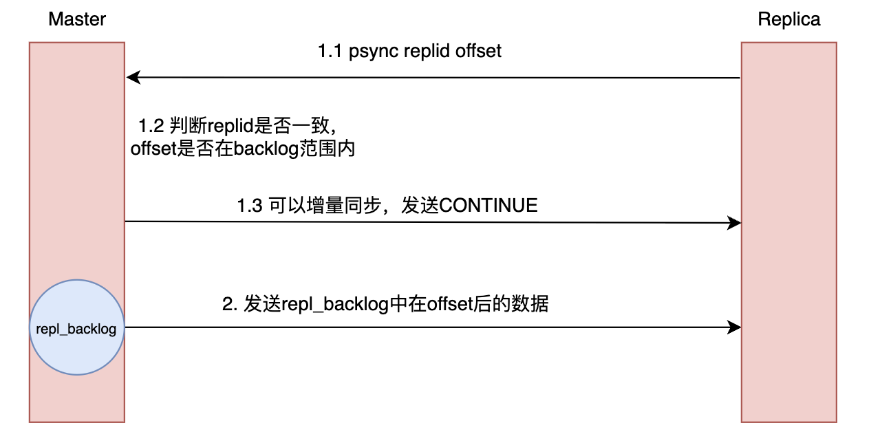 在介绍增量同步的具体实现前,我们先来讲一下主节点如何判断是否能进行增量同步。判断的依据来源于replica发送的PSYNC命令中的两个参数:replid 和offset。