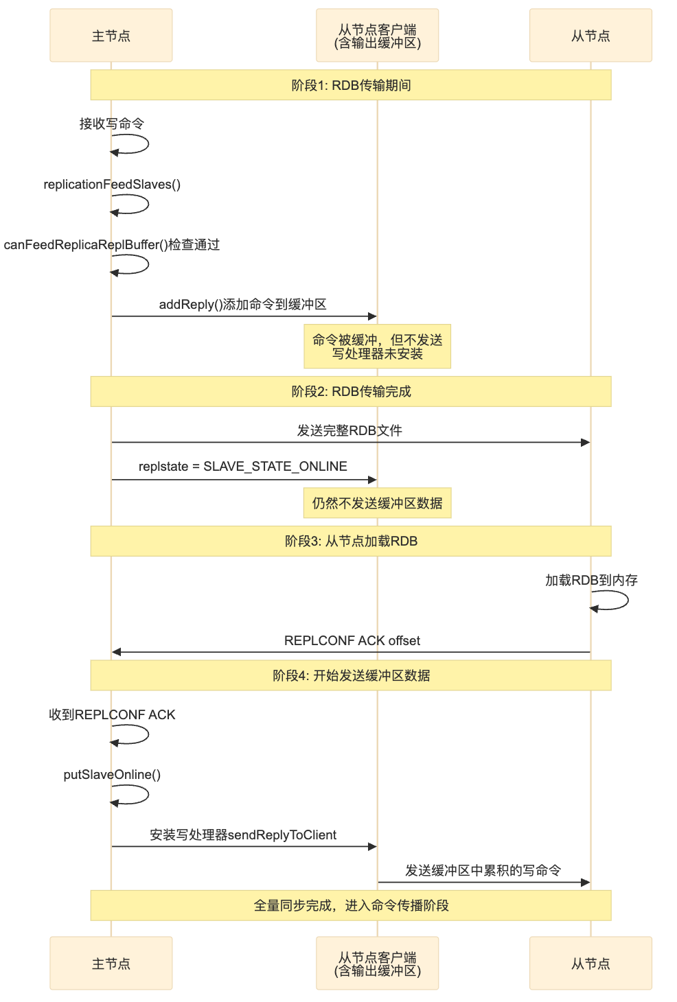 此外,正如前文提到的,主节点上述过程期间的数据变更也必须传递到从节点。为了实现这点,主节点会将 RDB 生成、接收、加载期间的写命令都暂存到自己给副本客户端准备的输出缓冲区中,待从节点加载完 RDB 后发送给从节点。如此一来,从节点便拥有了与主节点一模一样的数据,并且同步期间主节点能照常处理请求。