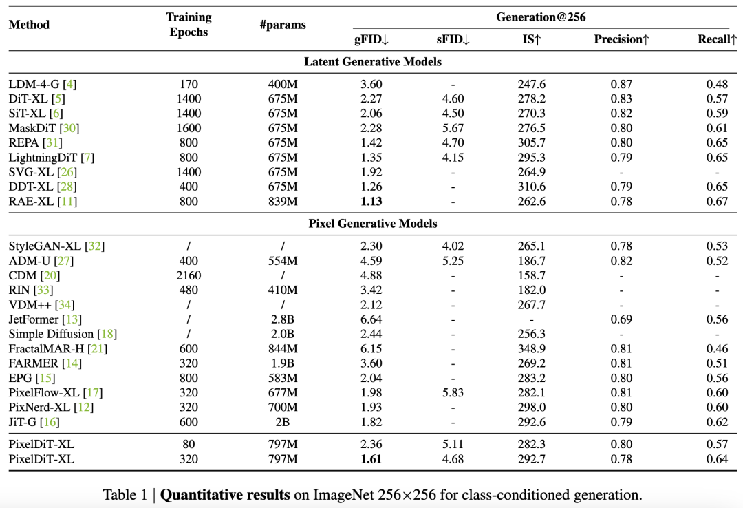 在标准 50K 采样评估上,本工作报告了 gFID、sFID、IS、Precision–Recall。与像素生成系的代表方法(如 PixelFlow-XL、PixNerd-XL、JiT-G 等)相比,PixelDiT-XL 以显著更低的训练周期开销达到更好的或相当的 gFID,并在长训练(320 epoch)时取得 1.61 的 gFID 与 4.68 的 sFID,IS 为 292.7,Recall 达到 0.64,显示出在像素空间中逼近甚至改写既有上限的潜力。相较于隐空间的 DiT 系列(如 DiT-XL、SiT-XL、MaskDiT、LightningDiT、REPA/RAE 等),本工作虽不依赖 VAE,但质量与多样性指标已能与强潜在基线竞争,尤其在更长训练与更优 CFG 区间设置时进一步逼近最佳。