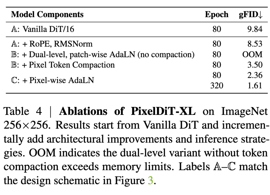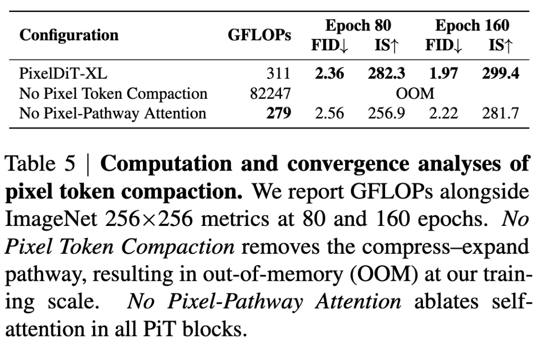 若引入双层级架构但不使用像素 token 紧凑化(pixel token compaction),会导致全局注意力计算量随像素数量呈二次方增长,从而引发显存溢出(OOM)。加入像素 token 紧凑化解决了这一瓶颈,它将全局注意力的序列长度从 个像素缩短为 个 patch,在同样的 80 epoch 预算下将质量显著提升至 3.50 gFID。