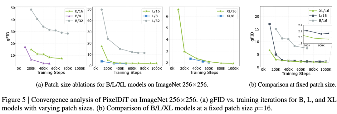 对于 Base 模型,将 减小到 和 显著加速了收敛:在 200K 次迭代时,gFID 从 48.5 (B/32) 降至 15.1 (B/16) 和 6.7 (B/4),且 B/4 最终在 500K 次迭代时达到 3.4 gFID。更大的模型遵循类似的趋势,但极小 patch 带来的收益随着模型规模的增加而递减。对于 PixelDiT-L,使用 而非 仅适度改善了 gFID(在 300K 迭代时从 2.72 降至 2.15),而对于 PixelDiT-XL,( 和 之间的差距进一步缩小... 注:原文此处截断)。