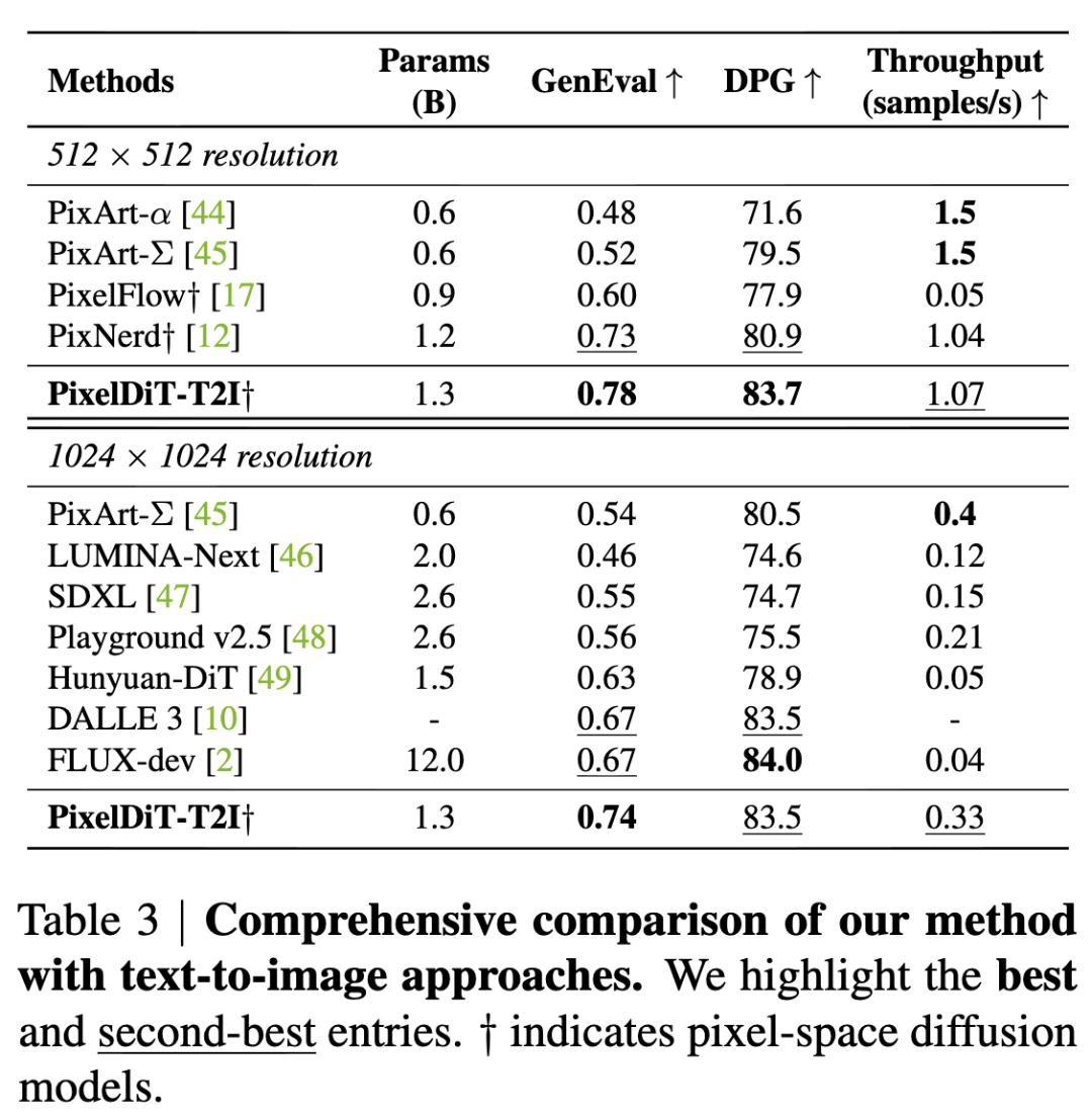 在 GenEval 与 DPG-Bench 上,本工作重点评测文本对齐、计数、颜色/位置属性与组合关系的稳健性。PixelDiT-T2I 在 512×512 达到 GenEval Overall 0.78,1024² 达到 0.74;DPG-Bench 上分别为 83.7 与 83.5。与同为像素空间的近期系统相比,PixelDiT-T2I 的综合得分更高或更均衡;对比多款主流隐空间扩散系统(如 SDXL、Hunyuan-DiT、Playground 等),在 1024² 的综合表现接近甚至在部分维度上可比,同时参数规模更为紧凑。这表明双层级 DiT 在高分辨率的语义一致性和构图控制方面具有竞争力,缩小了像素空间与隐空间在大模型上的差距。