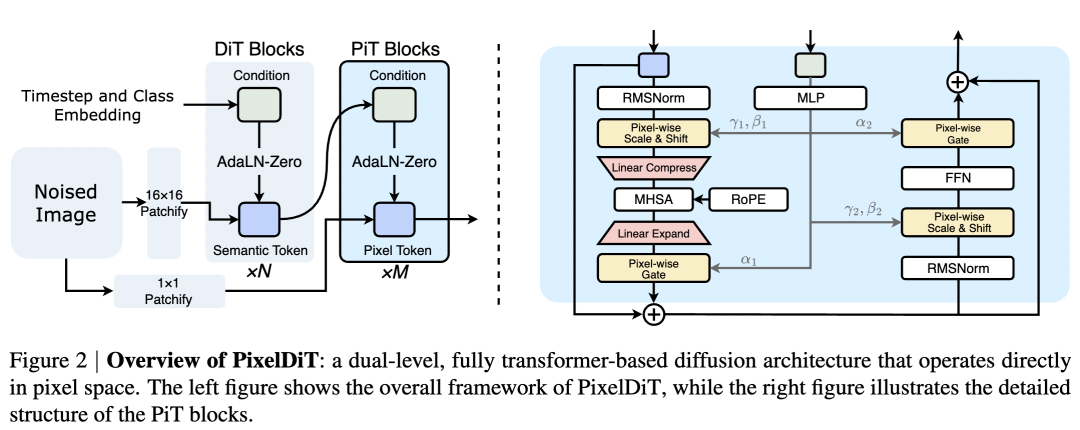 PixelDiT,这是一种基于 Transformer 的扩散模型,直接在像素空间执行去噪。本工作的目标是在保持潜空间(latent space)方法所具备的收敛行为和样本质量的同时,使像素 Token 建模在计算上更加高效。