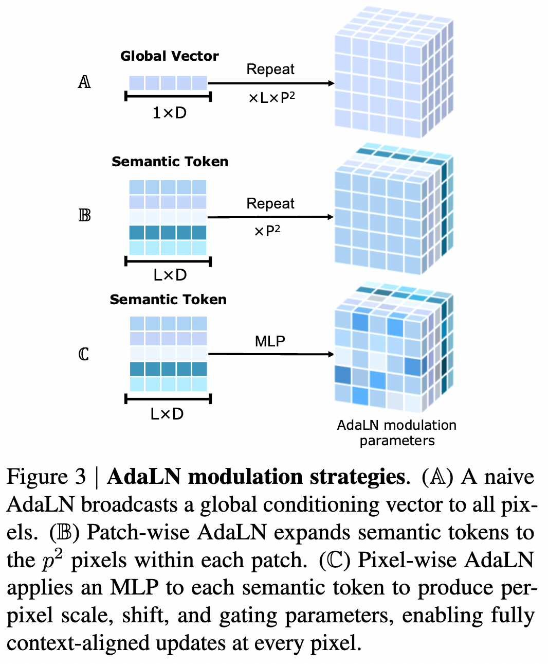 逐像素 AdaLN 调制。在像素级路径中,每个图像通过线性层被嵌入为“每像素一个 token”的形式: