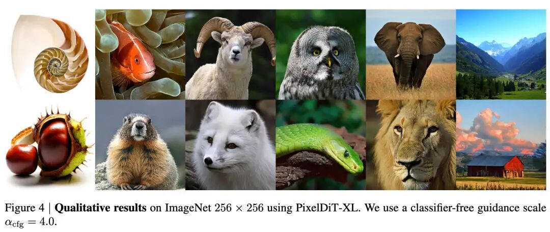 实验围绕 PixelDiT 在类条件与文本到图像两大任务上的有效性、可扩展性与推断效率展开。整体思路是先在 ImageNet 256×256 的类条件生成上建立像素空间 DiT 的基线与上限,再扩展至 1024² 文本到图像场景,以验证双层级架构在高分辨率与复杂语义条件下的稳定性和质量。