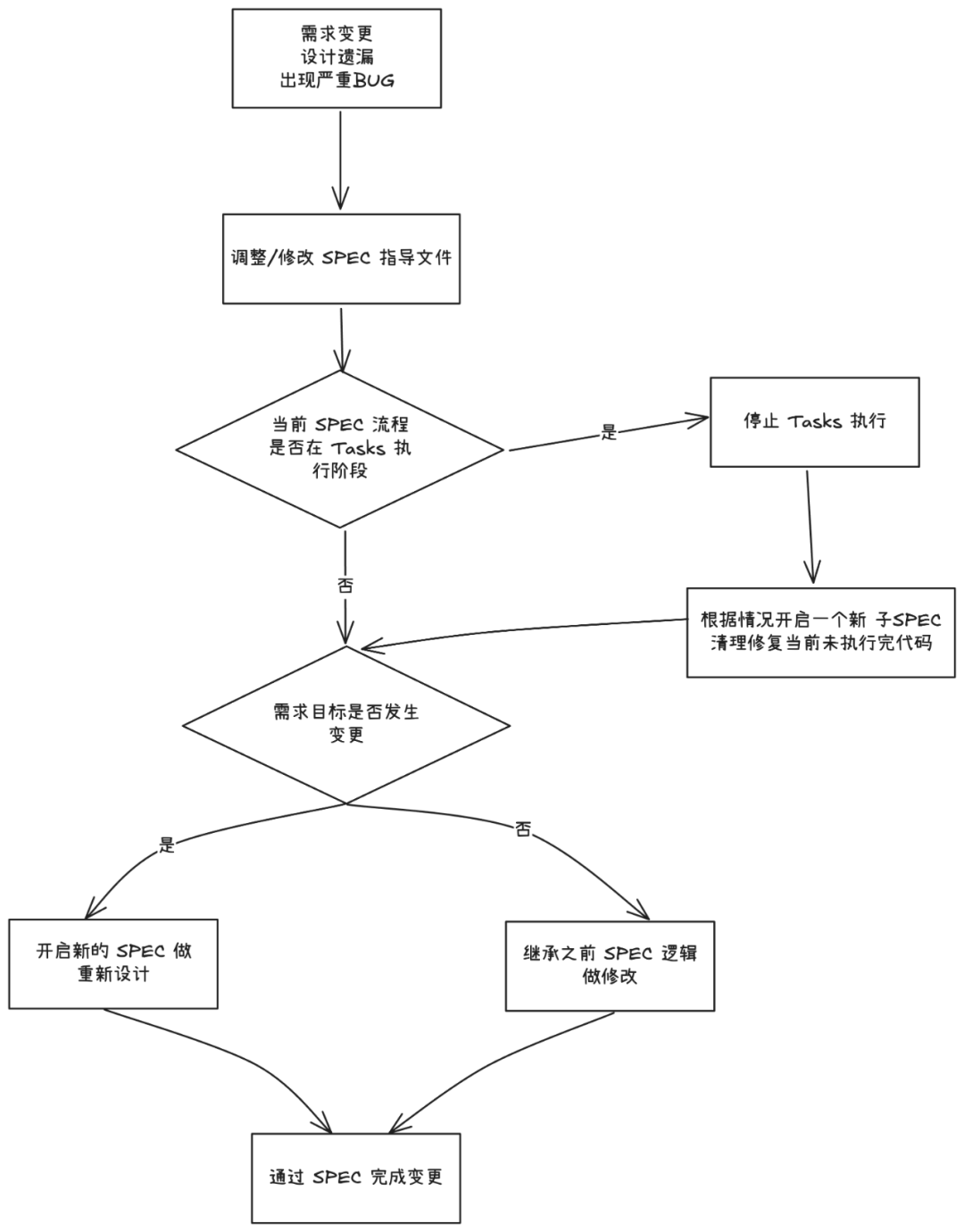 正确的做法是:把变更本身也当作一个需要通过 SPEC 来管理的需求。遇到任何意外情况,都应该先调整 SPEC,而不是直接去改代码。