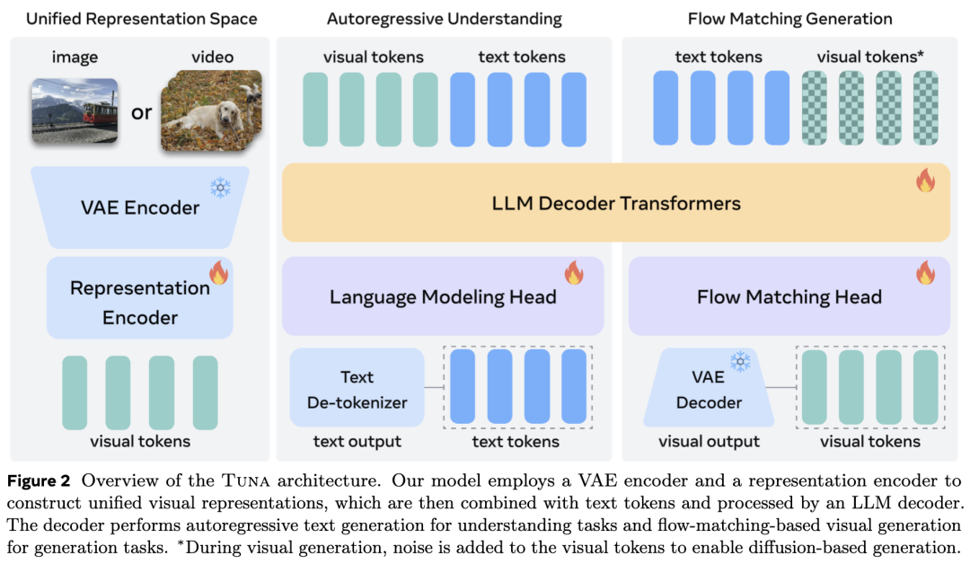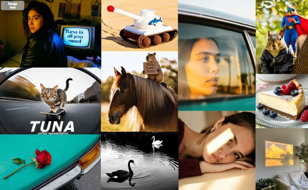 图1 展示了Tuna,这是一个基于统一视觉表示的原生统一多模态模型,支持多样的多模态理解与生成能力,如图像和视频理解、图像与视频生成以及图像编辑。