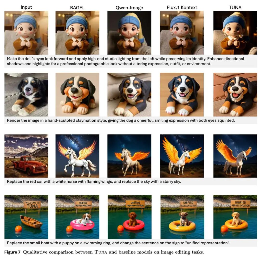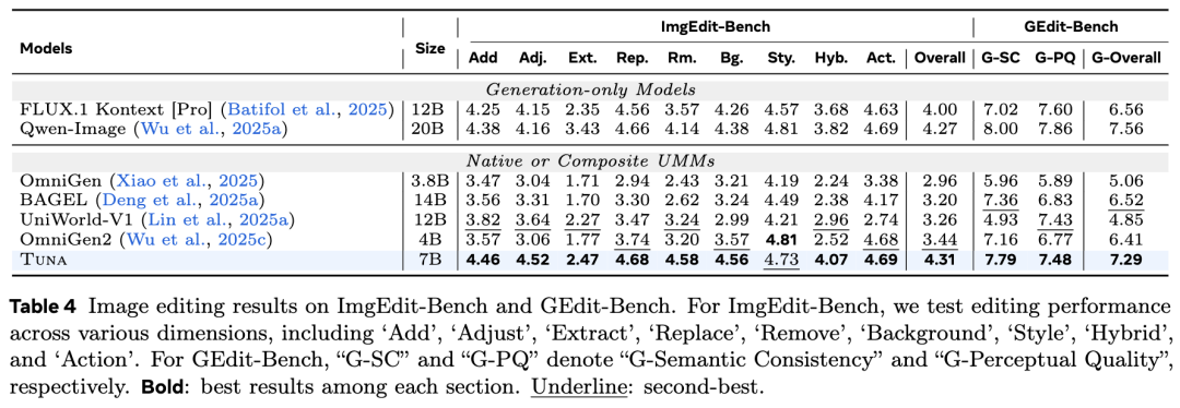 图像编辑使用 ImgEdit-Bench 和 GEdit-Bench 进行评估。如下表 4所示,Tuna 在 ImgEdit-Bench 上取得了 4.31 的总分,在所有 UMM 中排名最高,且与 FLUX.1 等纯生成模型相当。在 GEdit-Bench 上,Tuna 在所有统一模型中得分最高。下图 7 展示了定性结果,Tuna 能够准确执行风格迁移、环境更改和对象替换等操作。