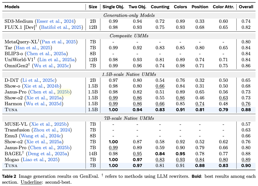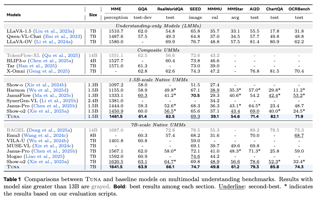 图像理解本工作在 MME、GQA、MMMU 等 9 个基准上评估了 Tuna。如下表 1所示,无论是 1.5B 还是 7B 版本,Tuna 几乎在所有基准测试中都达到了最先进(SOTA)的结果。Tuna 不仅与纯理解模型相比具有竞争力,而且优于许多复合型 UMM 和更大规模的 UMM,证明了统一表示的有效性。