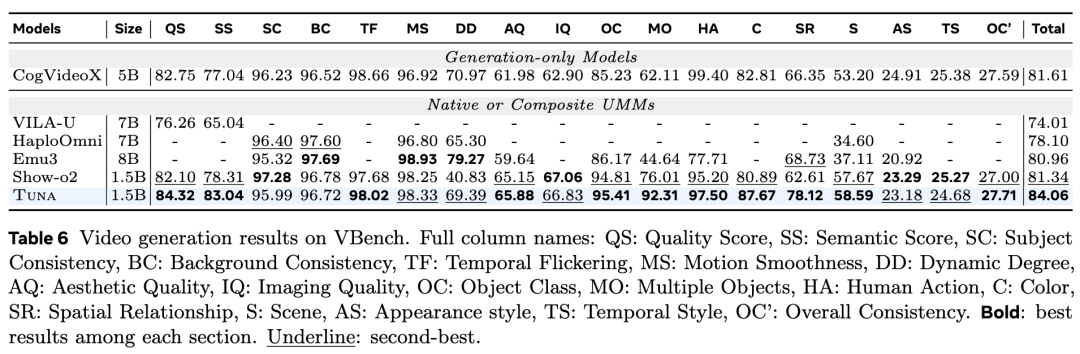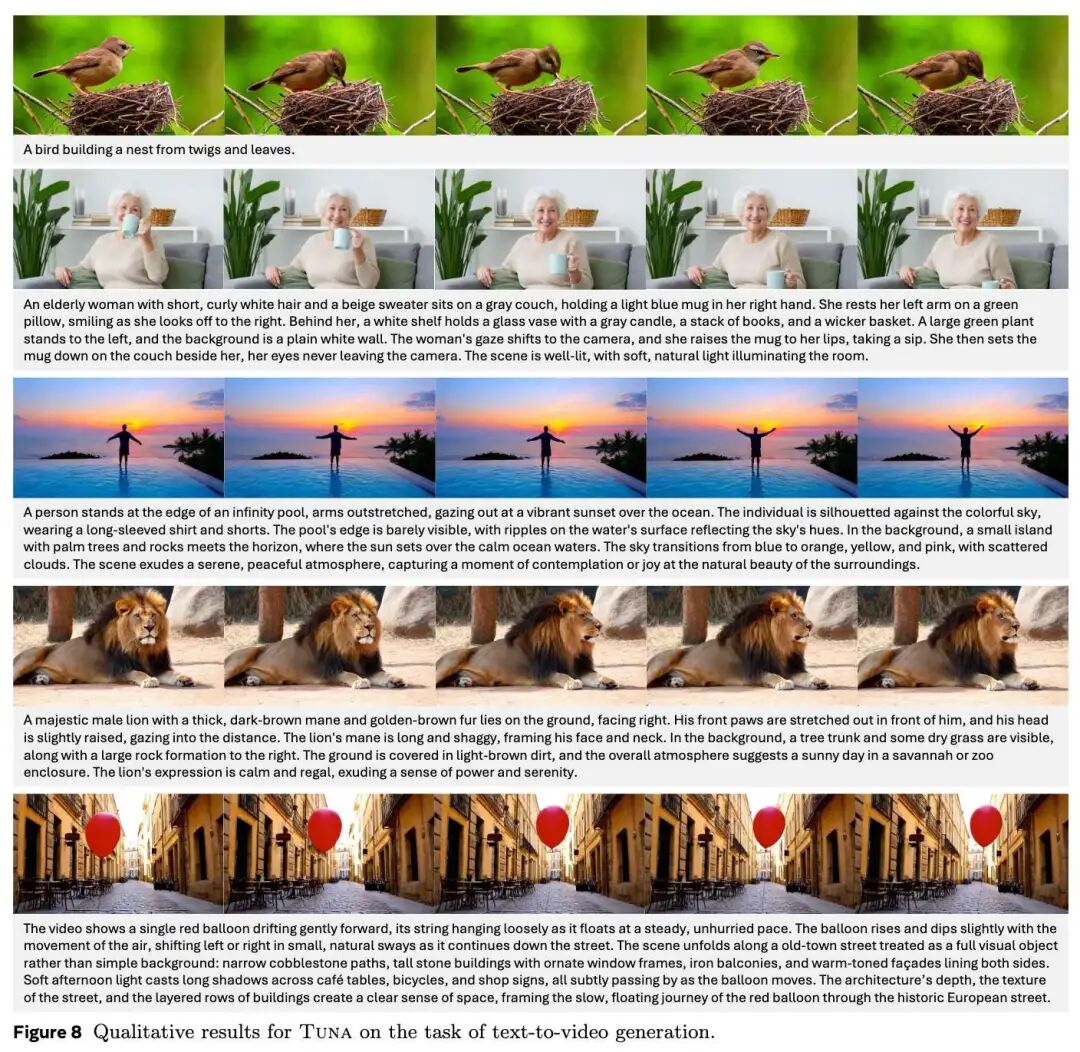 视频生成在 VBench 上的评估结果如下表 6所示,Tuna 实现了 SOTA 性能,超越了所有现有的具备视频生成能力的 UMM,同时仅使用了 1.5B 参数的 LLM 解码器。定性结果如下图 8所示,展示了 Tuna 生成高保真视频的能力。