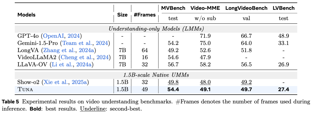视频理解在 MVBench、Video-MME 等四个视频基准上的评估结果如下表 5所示。Tuna 在 MVBench 和 Video-MME 上优于 Show-o2,并在其他基准上表现出竞争力。即使是 1.5B 参数的模型,其性能也能与更大的纯理解模型相媲美。