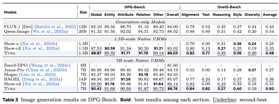 图像生成在 GenEval、DPG-Bench 和 OneIG-Bench 三个基准上评估了 Tuna。结果如下表 2和下表 3所示。Tuna 始终优于包括 Janus-Pro、BAGEL 和 Mogao 在内的现有方法。特别是在 OneIG-Bench 中,Tuna 在文本渲染质量方面表现出显著优势,这表明其在处理包含视觉文本信息的复杂指令时具有强大的语义理解能力。
